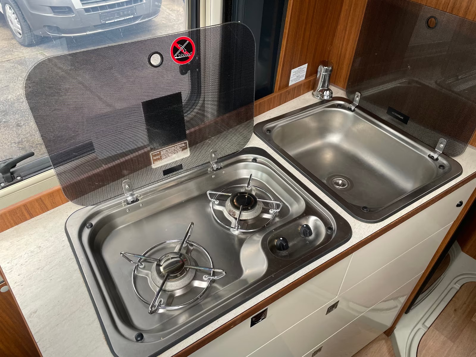 - Plynový dvojhorák s nerezovým drezom a skleneným krytom